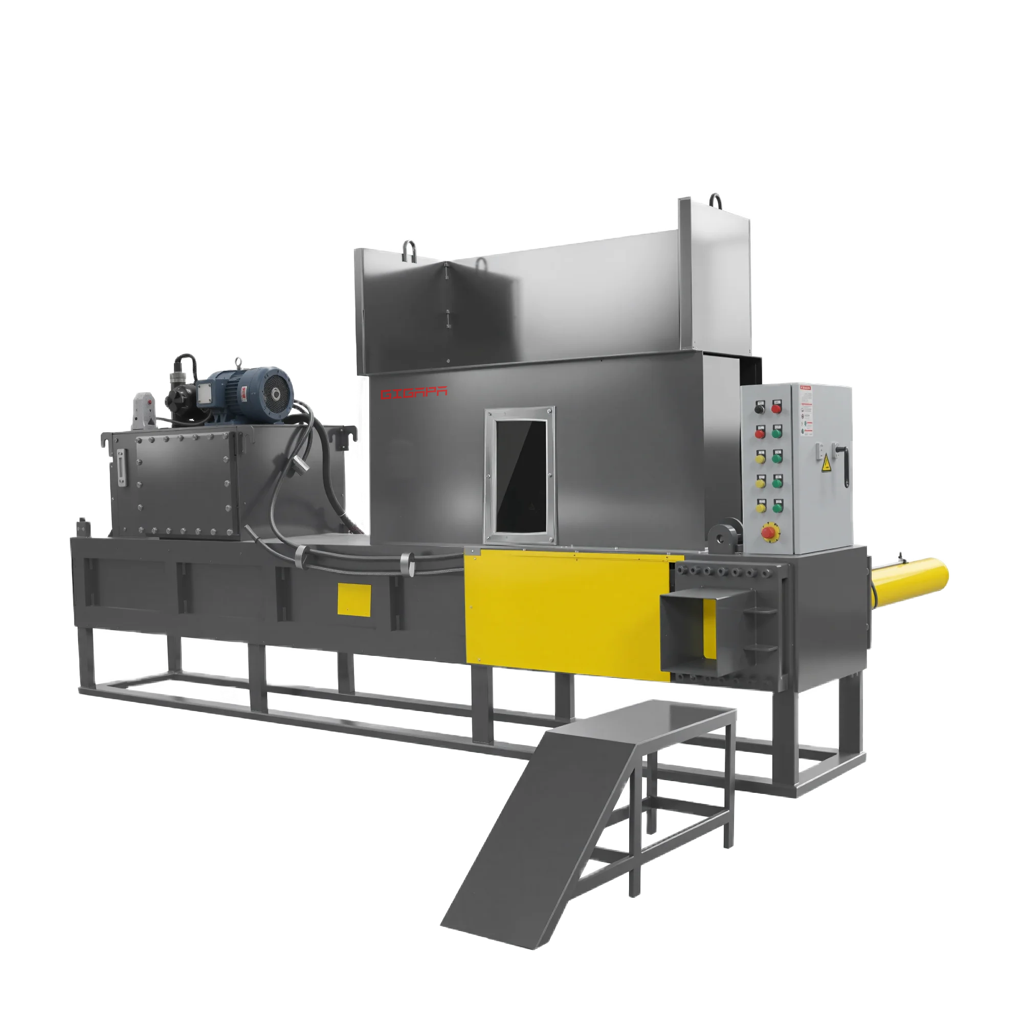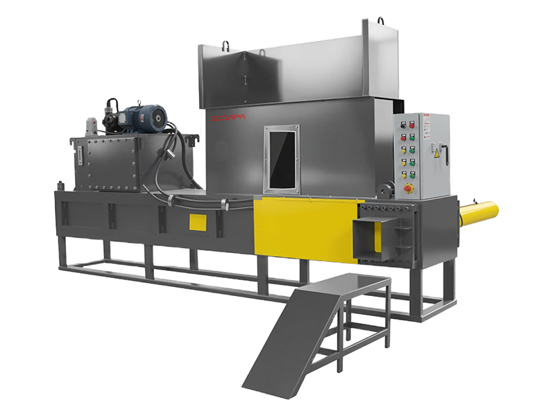 套袋打包机由机箱、挡包门、压头、液压缸、液压站等组成。液压站负责提供液压力驱动各个液压缸动作,物料在压缩室内被多次多方向压缩后再打开小门,然后由液压缸将包块推入已经套在出口上的袋子中。套袋打包机主要用于无法进行捆扎打包的碎料或对物料存储有要求的物料。打包后的物料包块呈标准长方体,既美观又方便堆垛装箱,运输过程中还不会出现洒落现象。如果使用PE塑料袋配合抽真空包装还可有效防止运输储存时物料受潮发霉。配合称重输送机使用可准确控制每袋重量,再配合刨花机、筛选机等可形成一条完整的木刨花生产打包线。